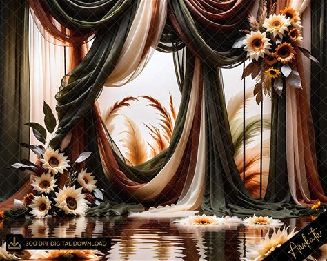 Fall Sunflowers And Flowing Fabric Digital Photography Backdrop, Autumn Digital Background, Fall Digital Photoshop Overlay, Fall Background