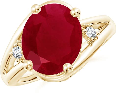 Angara 3.41 CTW Solitaire Oval Ruby Split Shank Engagement Ring With Trio Diamonds In 18K Yellow Gold