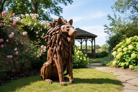 Teak Wood Natural Sculpture Sitting Lion Large Statue Hand Carved Art Deco