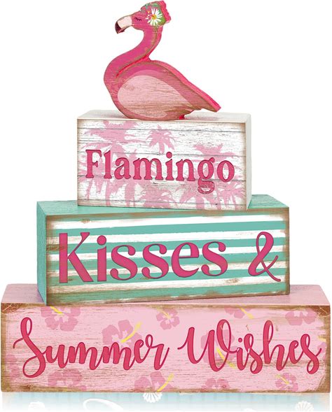 Burbell 4 Pcs Pink Flowers Wooden Tiered Tray Decor Farmhouse Table Decor Stack Books Signs Block For Table Home Office Decorations(Flamingo Style)