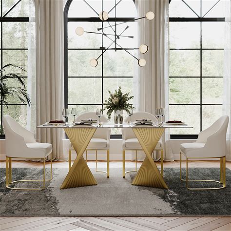 Stone Dining Table Set For 4-10 - Fox & Friends X Povison - 71" Modern Gold Spiral Dining Table For 4-6, White Glossy Sintered Stone Kitchen Table,