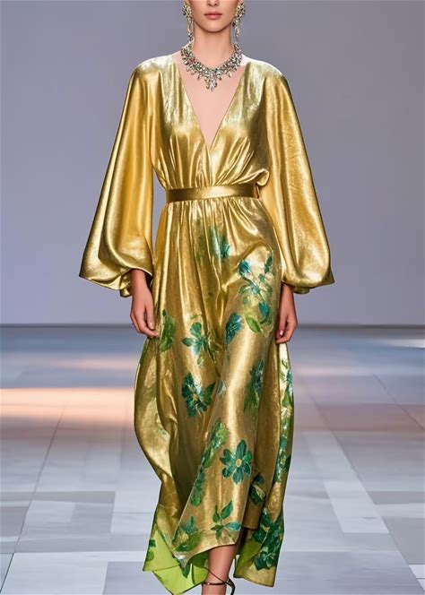 Bohemian Silk Evening Gown With Gold Print Lantern Sleeves Cinched Waist For Galas And Weddings