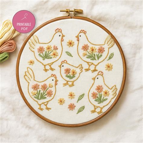 Floral Chicken Embroidery Pattern PDF - Country Farmhouse Hand Embroidery Design | Modern Hen & Chicks Hoop Art | Digital Pattern Download