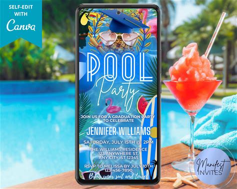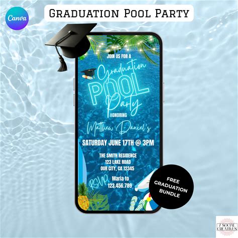 Animated Graduation Pool Party Invitation With Music: Tropical Blue, Digital Editable Canva Template